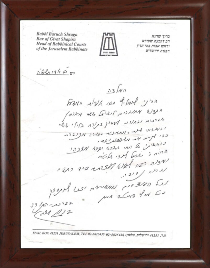 המלצה מאת ראש בתי הדין הירושלים הרב ברוך שרגא שליט"א