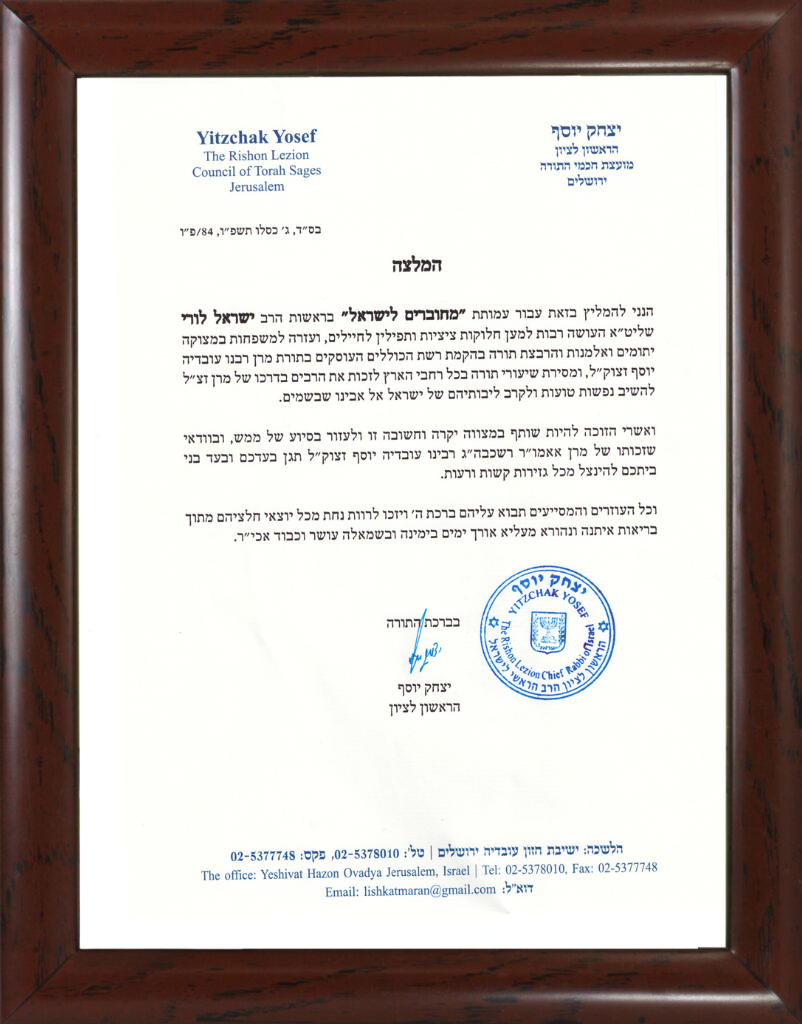 המלצה מאת מרן הראשון לציון ר' יצחק יוסף שליט"א